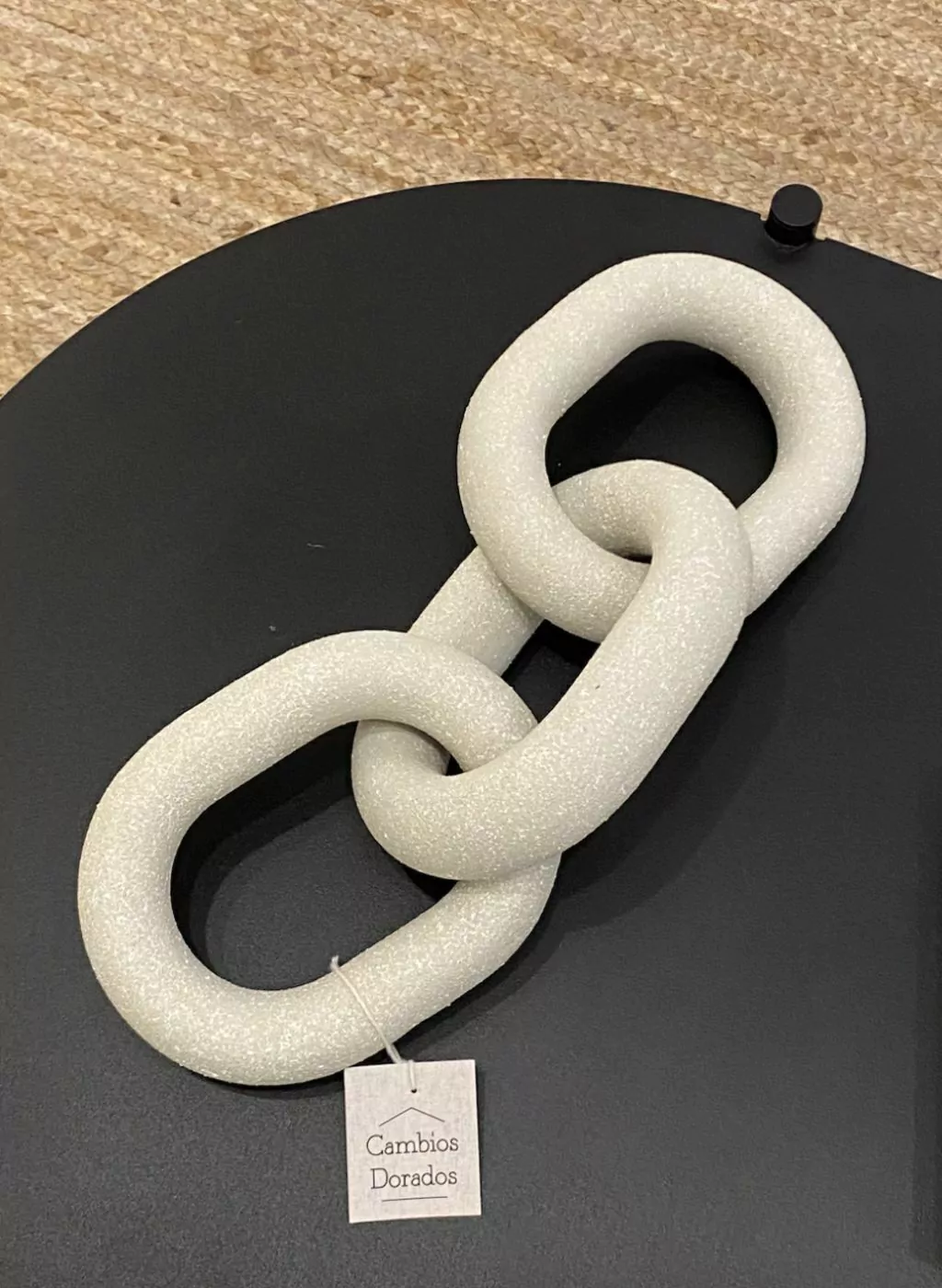 Descubre la Cadena Eslabon x3, un objeto decorativo de cerámica que aportará un toque de estilo y elegancia a tu hogar. Con una medida total de 34cm de largo y cada eslabón midiendo 15cm de largo x 12cm de ancho, esta pieza es perfecta para cualquier rincón.