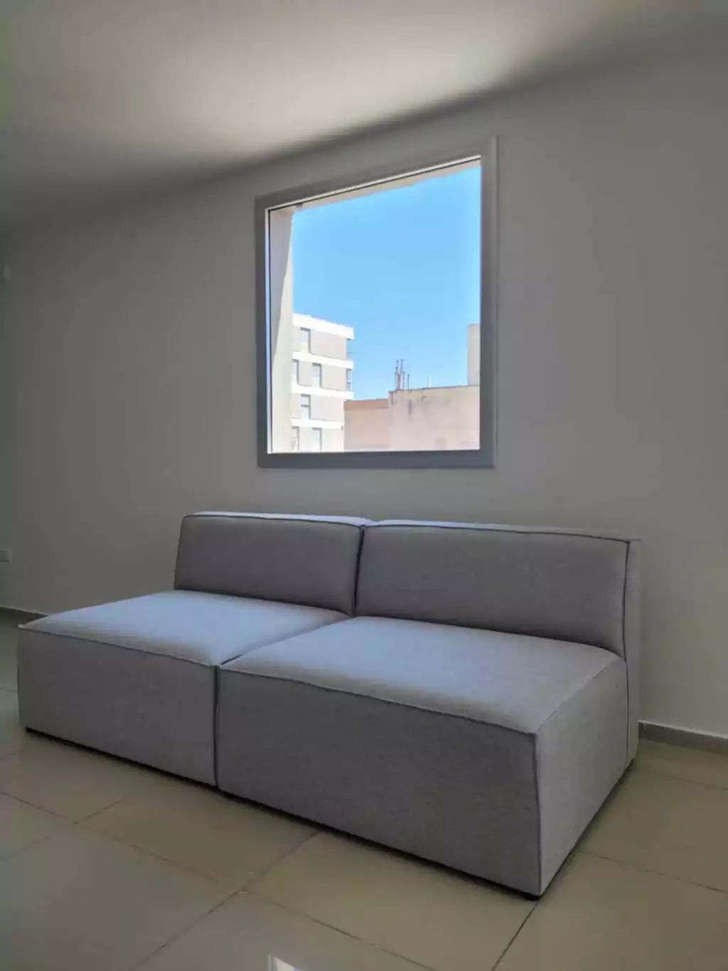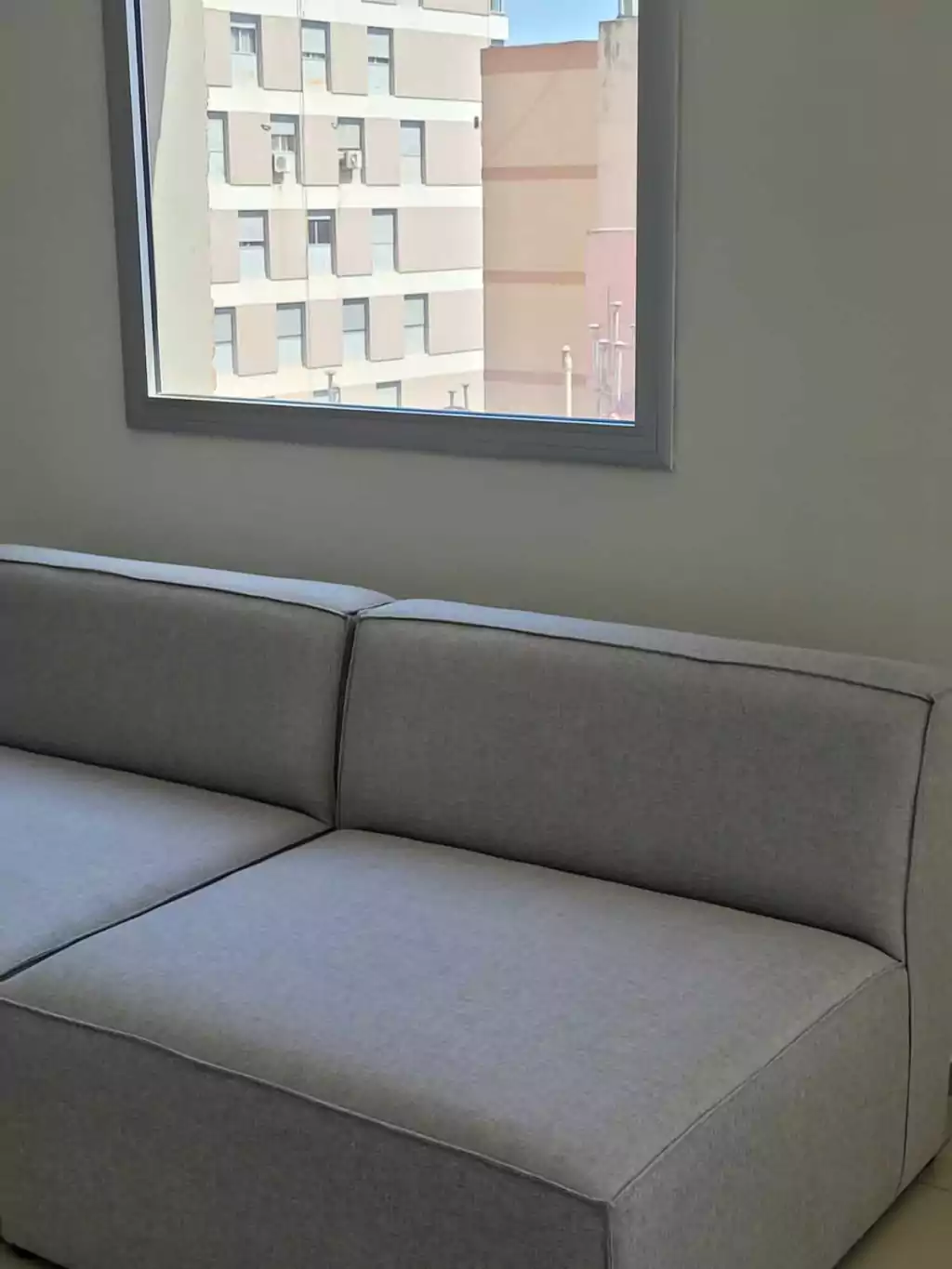 Su diseño sin apoyabrazos y las costuras a la vista le dan un toque contemporáneo y elegante. Está fabricado en tela Maui, conocida por su resistencia y fácil mantenimiento. Además, cuenta con una placa de alta densidad de 26 kg, asegurando durabilidad y comodidad.